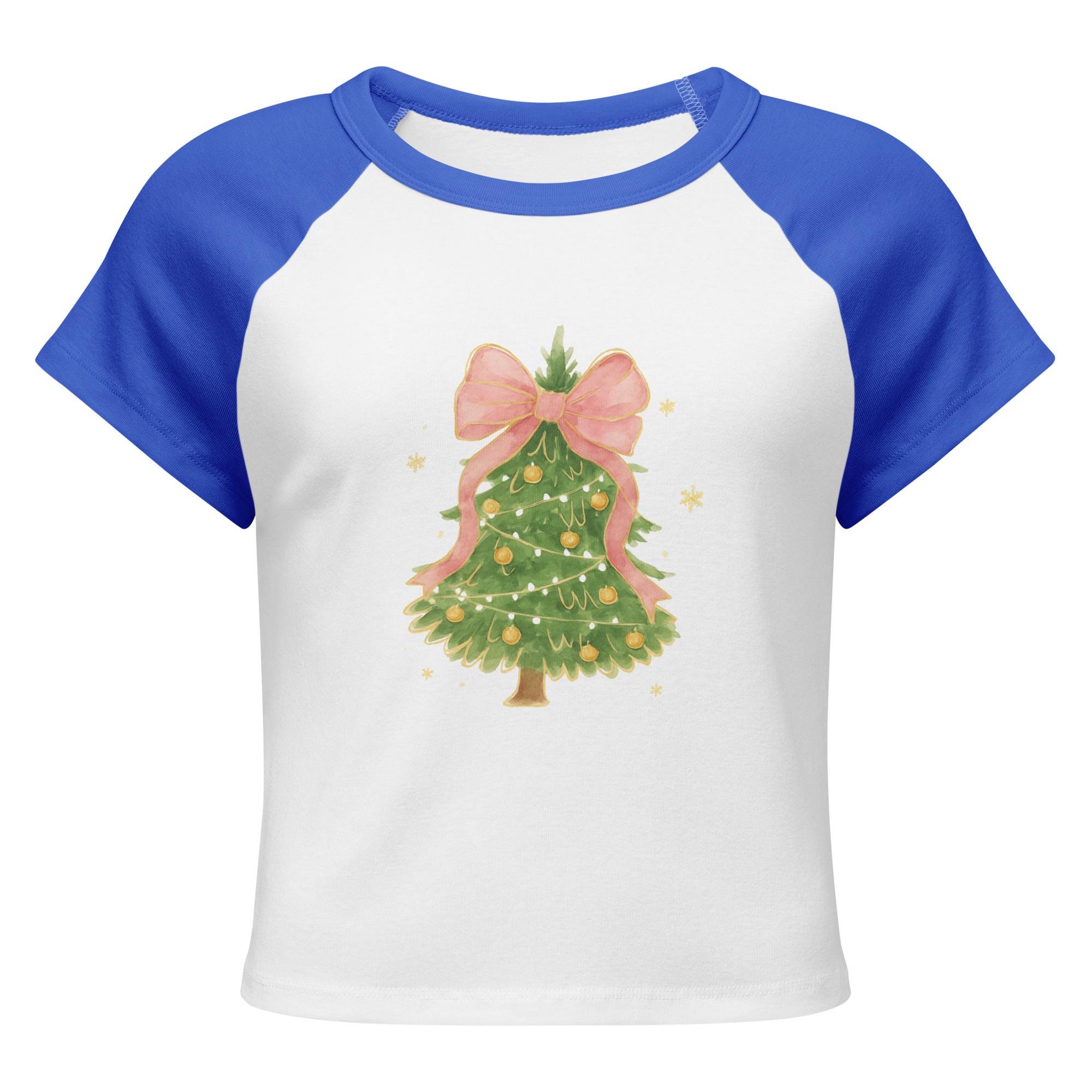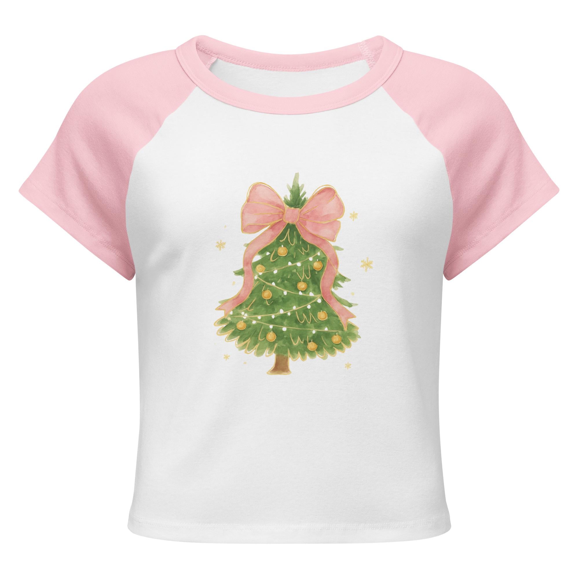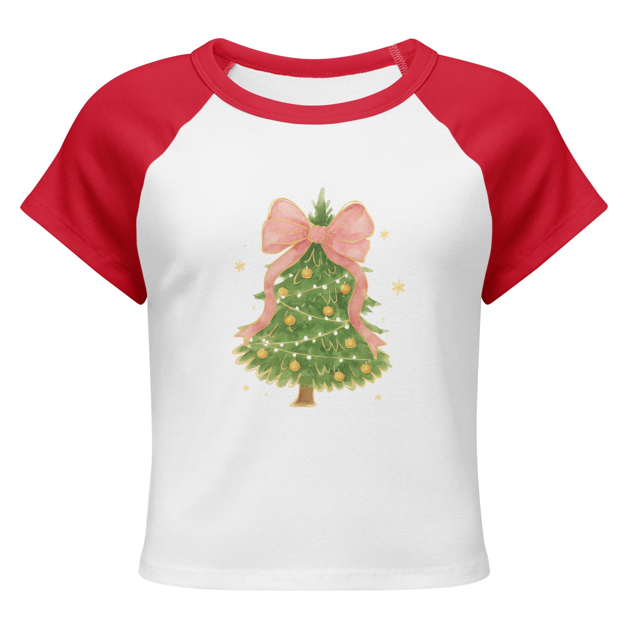 Women’s micro rib raglan baby tee, Christmas tee, Christmas Tree Bow Tee